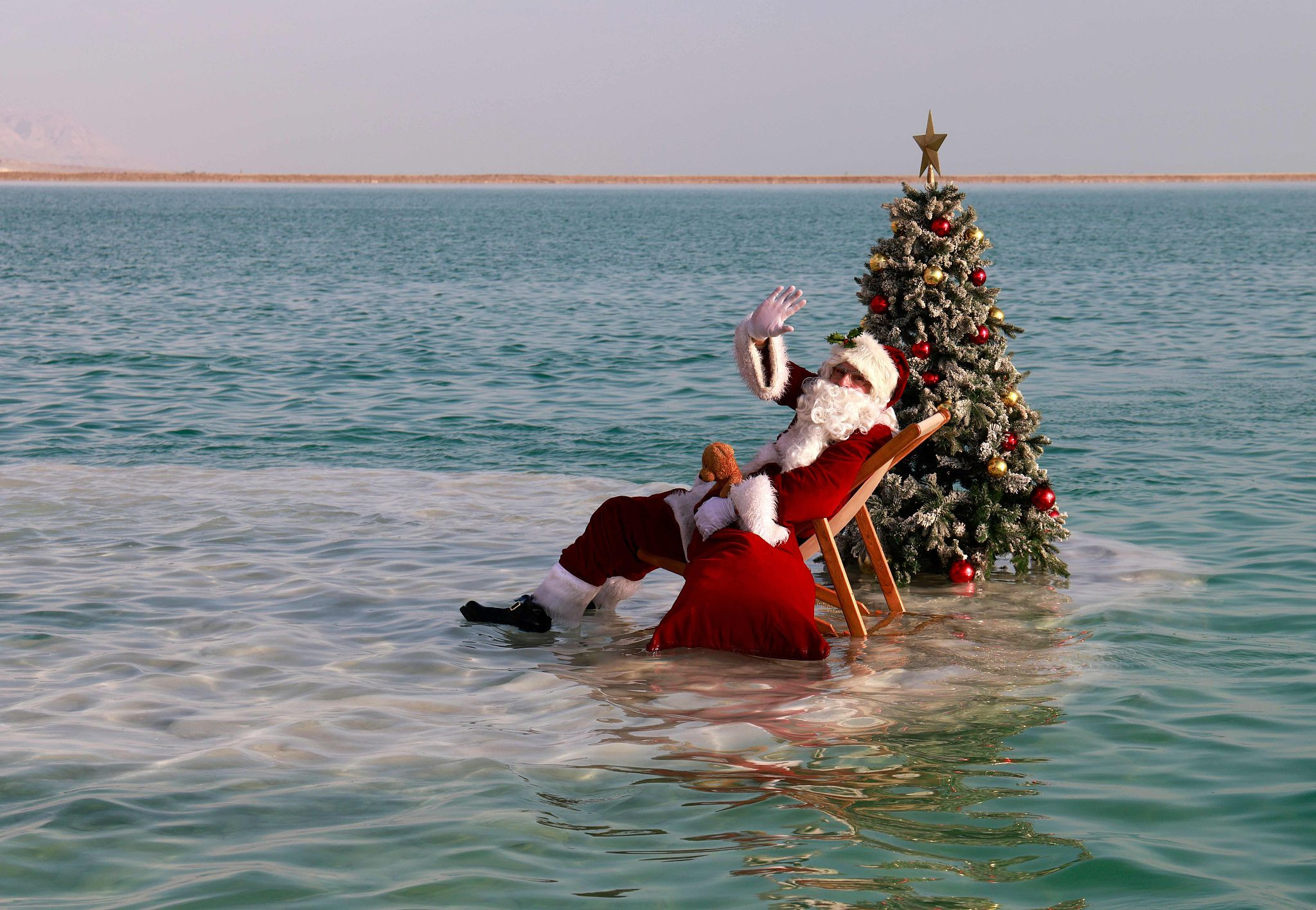 以色列“圣诞老人”漂浮在死海上 怡然自得