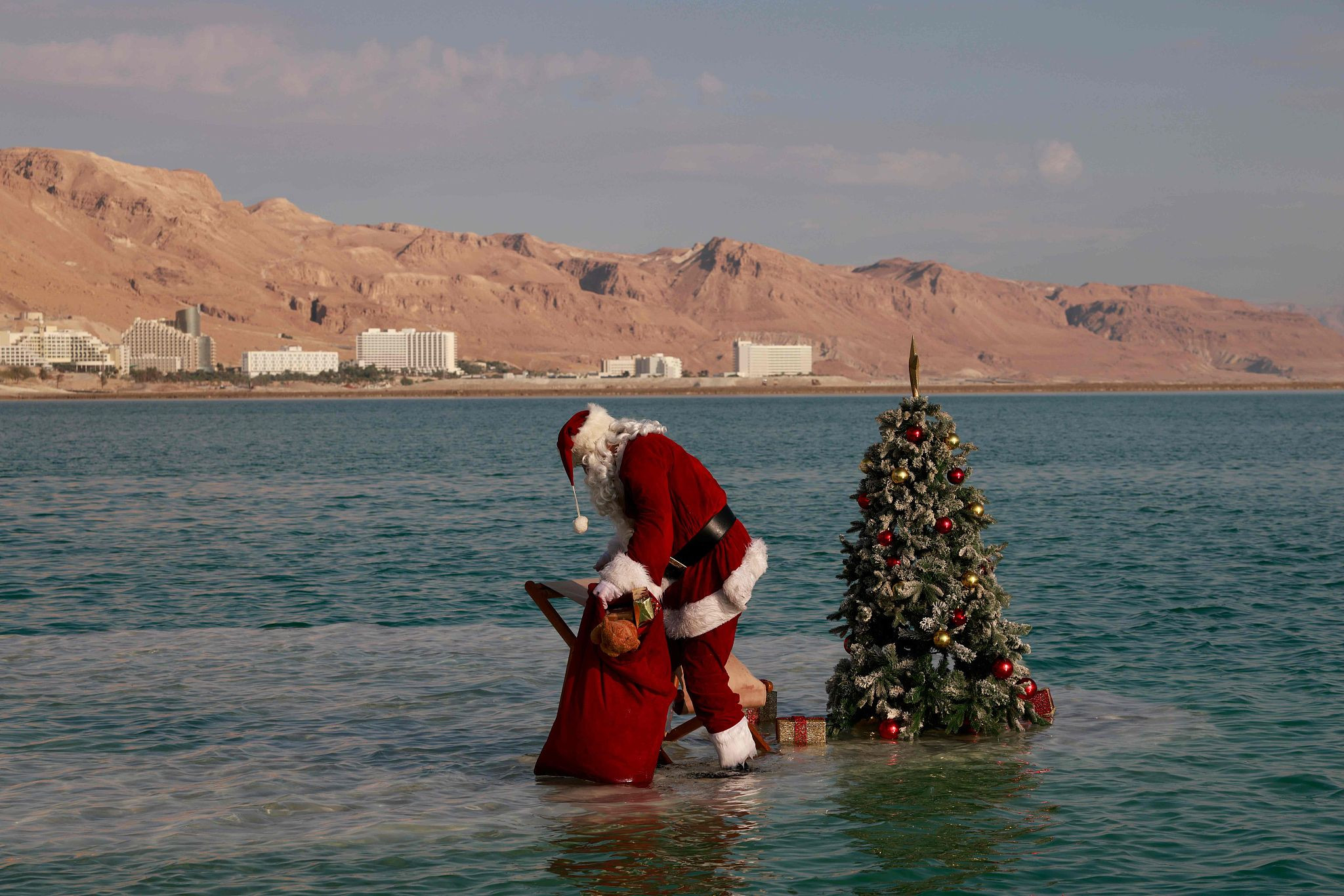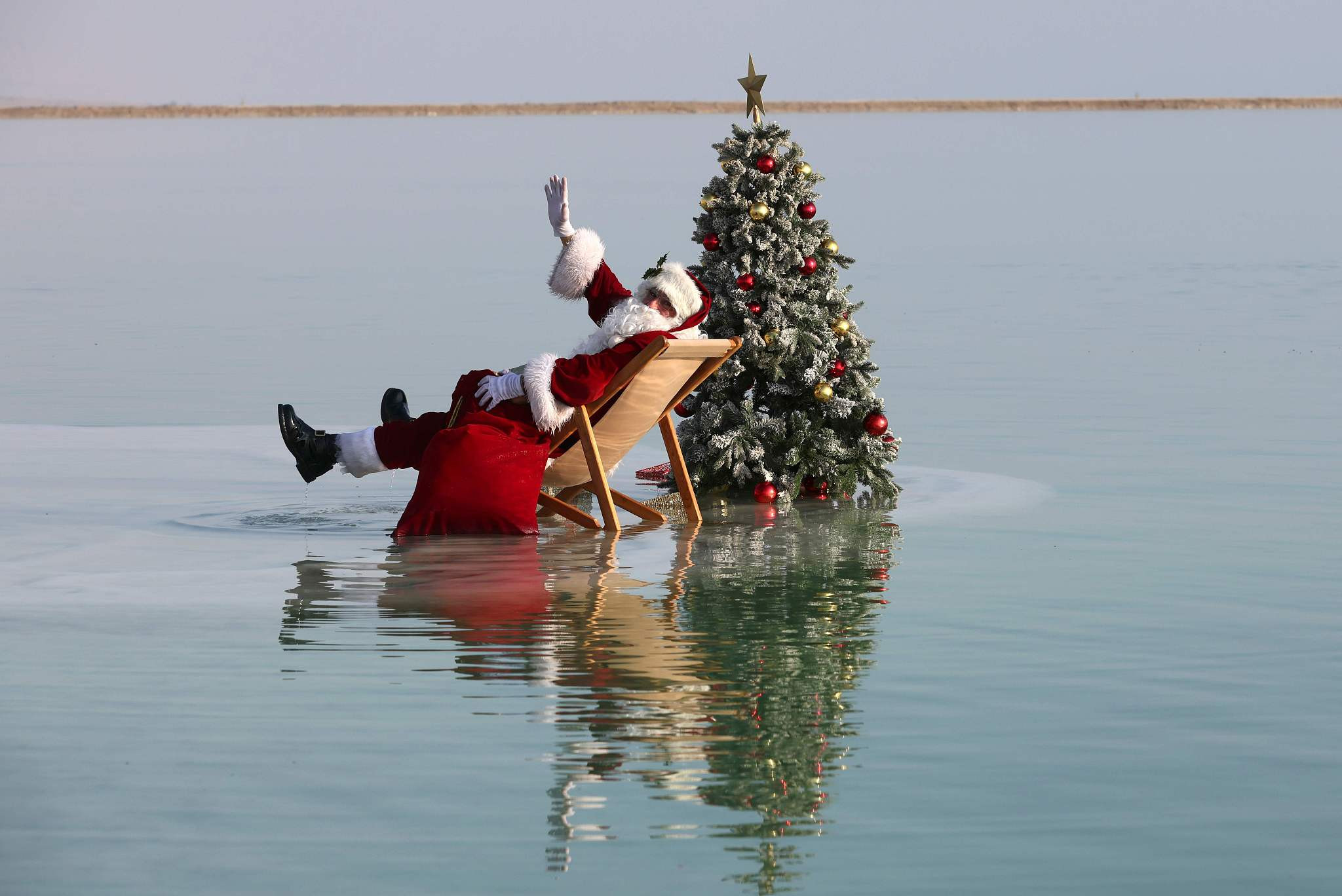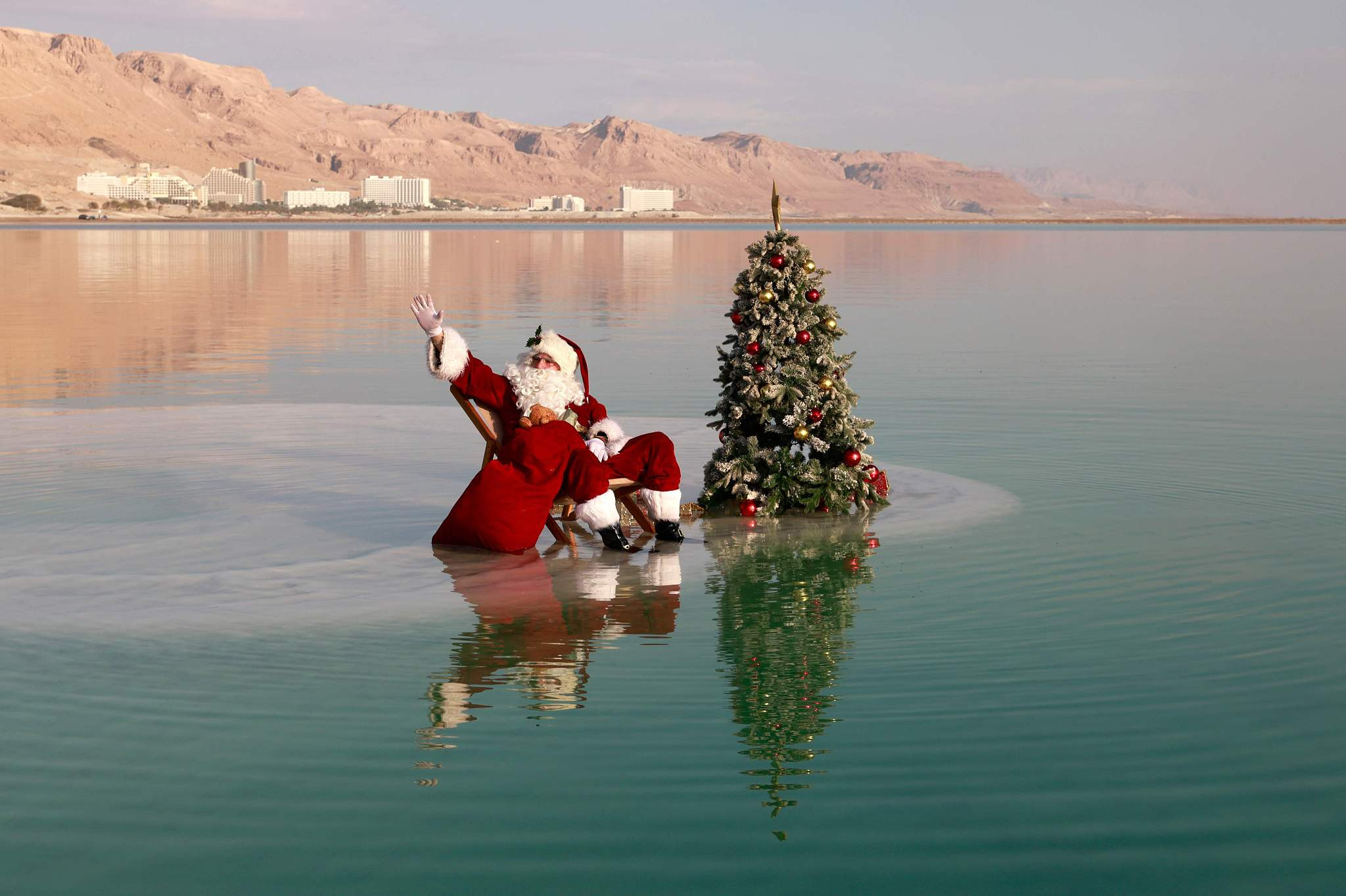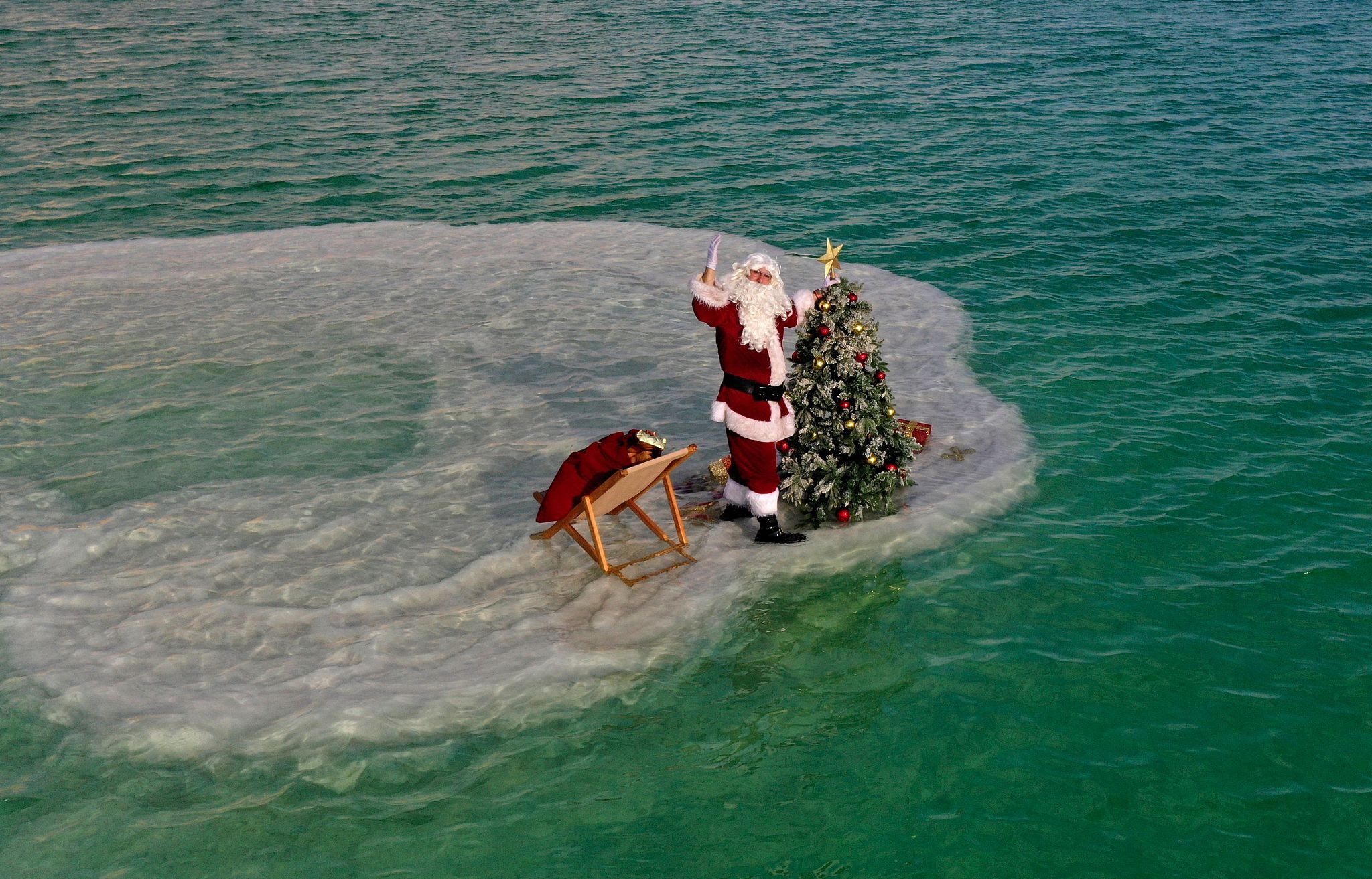 以色列尼夫佐哈附近,一名“圣诞老人”漂浮在死海上拍摄圣诞季广告。(来源:视觉中国)