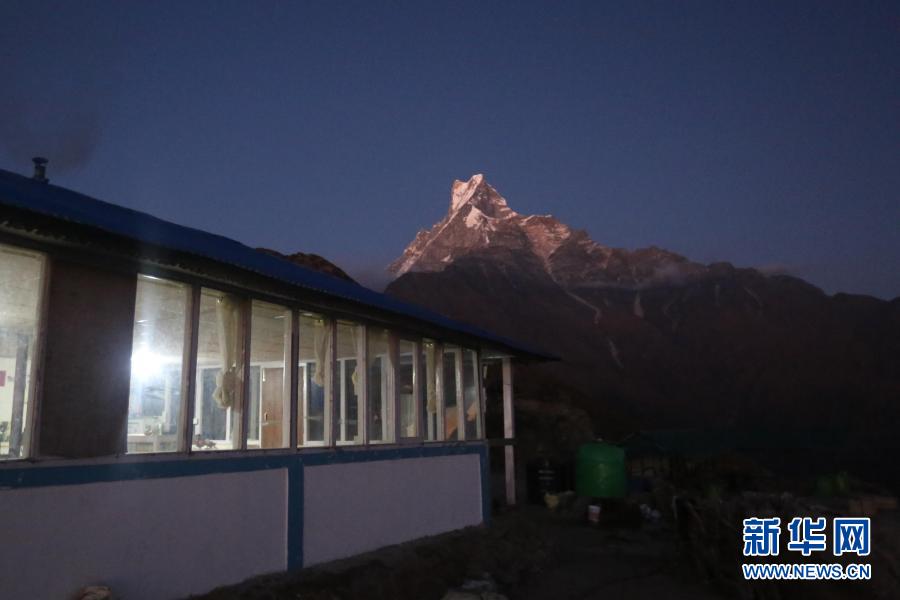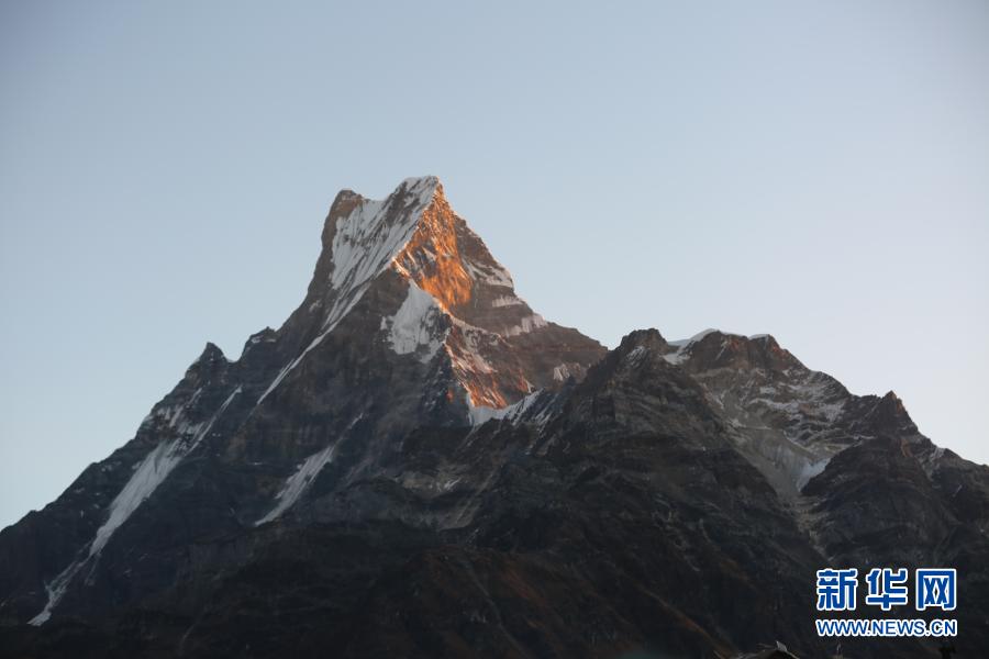 这是11月11日在尼泊尔安纳布尔纳地区拍摄的朝霞中的鱼尾峰。