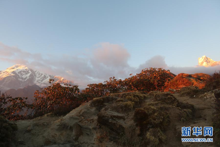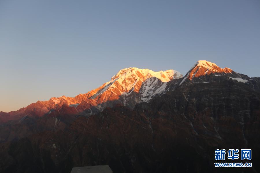 这是11月11日在尼泊尔安纳布尔纳地区拍摄的朝霞中的雪山。