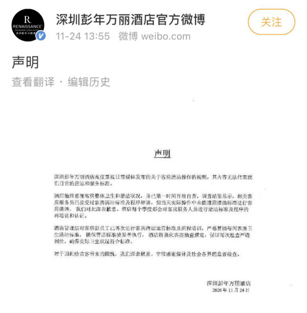 针对“万豪国际集团旗下深圳彭年万丽酒店服务员用浴巾擦马桶”一事,昨日,深圳彭年万丽酒店官方微博发布“声明”称,客房服务员当天实际操作中未能遵照清洁标准进行客房清洁,他们对此深表歉意。目前,他们对员工进行再次客房清洁运营标准及流程培训。