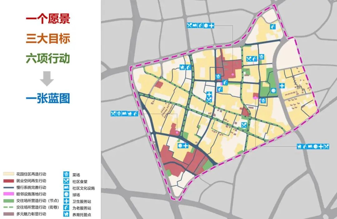 同时,为实现三大目标,街道重点聚焦“慢行系统完善”、“睦邻设置落地”、“交往场所营造”、“多元魅力彰显”、“花园社区营造”及“就业空间再生”等“六大行动”,形成了规划项目、在待建项目、储备项目等三类项目清单。