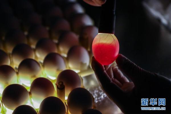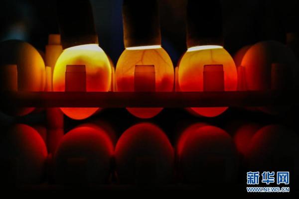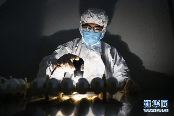 3月27日,在北京科兴生物制品有限公司流感疫苗生产车间,工作人员对鸡胚进行照检。透过蛋壳,小鸡胚胎的血管清晰可见,如果鸡胚的血管模糊不清或看不见,则不能用来生产疫苗。新华社记者 张玉薇 摄