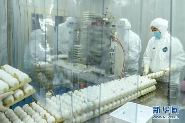 3月27日,在北京科兴生物制品有限公司流感疫苗生产车间,工作人员对鸡胚外观进行检查。新华社记者 张玉薇 摄