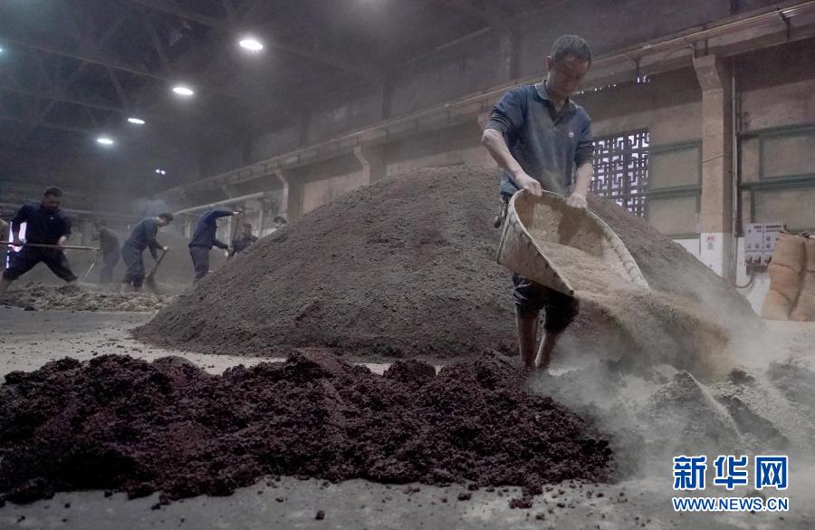 11月28日,酿酒工人在进行拌曲上堆操作。