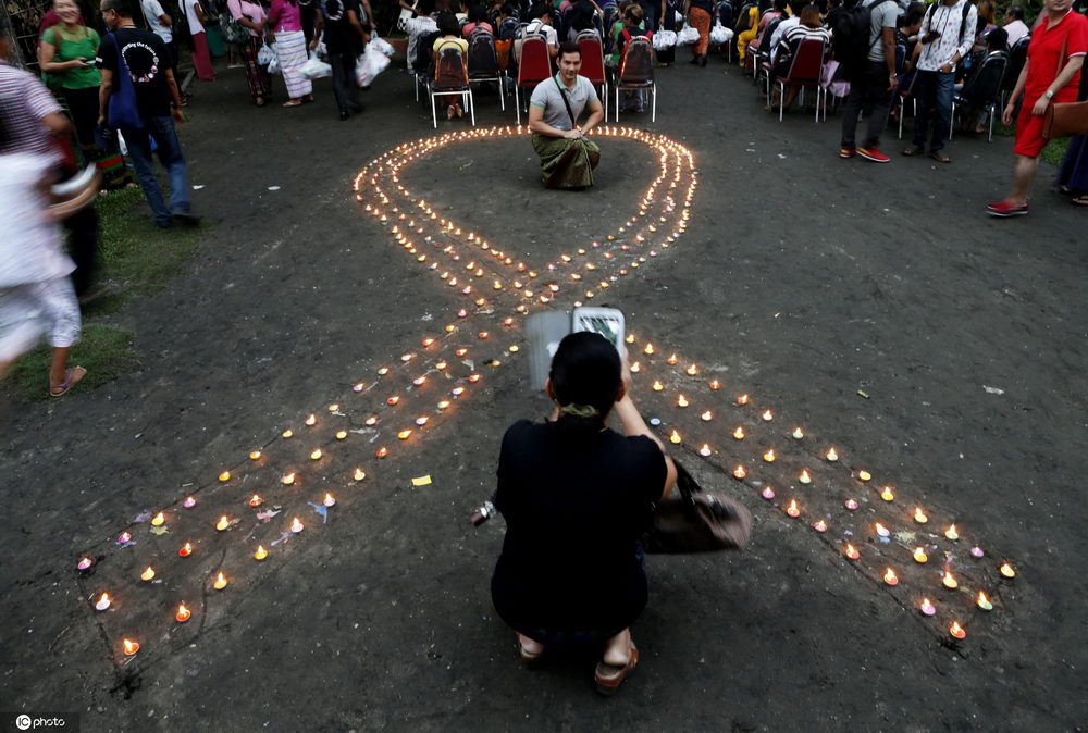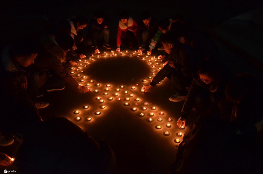 12月1日是第33个世界艾滋病日,红丝带标志被越来越多的人佩戴,表达对HIV和艾滋病的关心。图为当地时间2020年11月30日,尼泊尔加德满都,民众用蜡烛点亮“红丝带”,迎接12月1日“世界艾滋病日”的到来。
