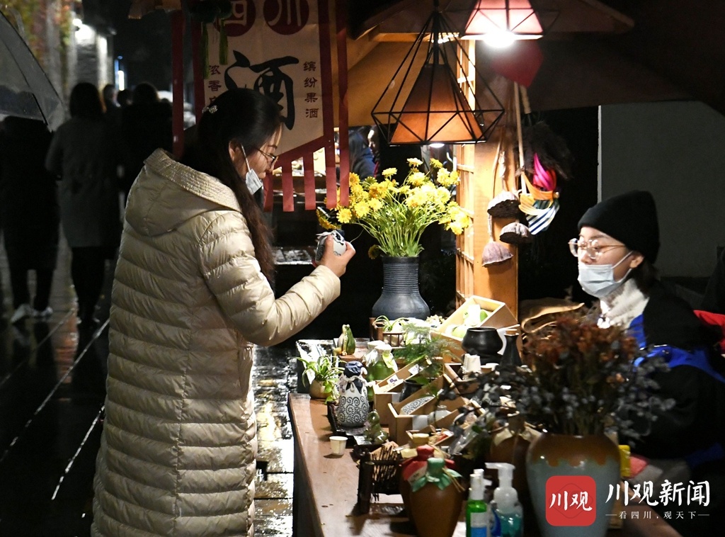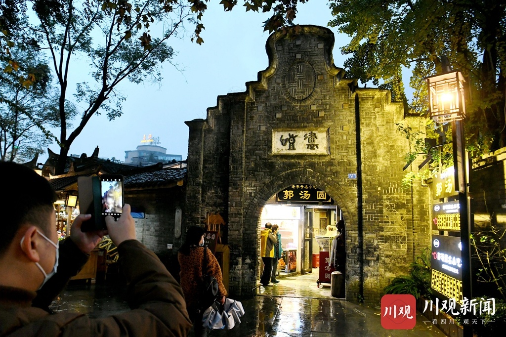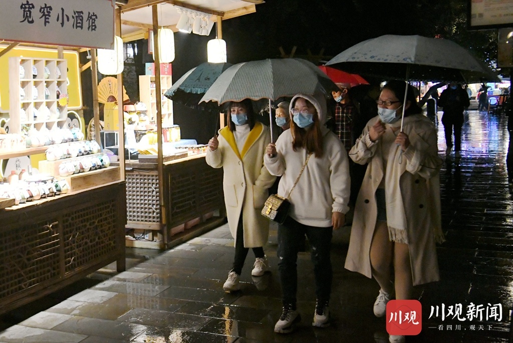 11月30日晚,不少来自省内外的游客在冬日的风雨中夜游成都宽窄巷子,在这个古老的街头游览不一样的蓉城夜色。游客在巷子里购买特色商品,品四川小食、吃成都火锅,感受这份来自冬日里宽窄巷子的热闹气氛。