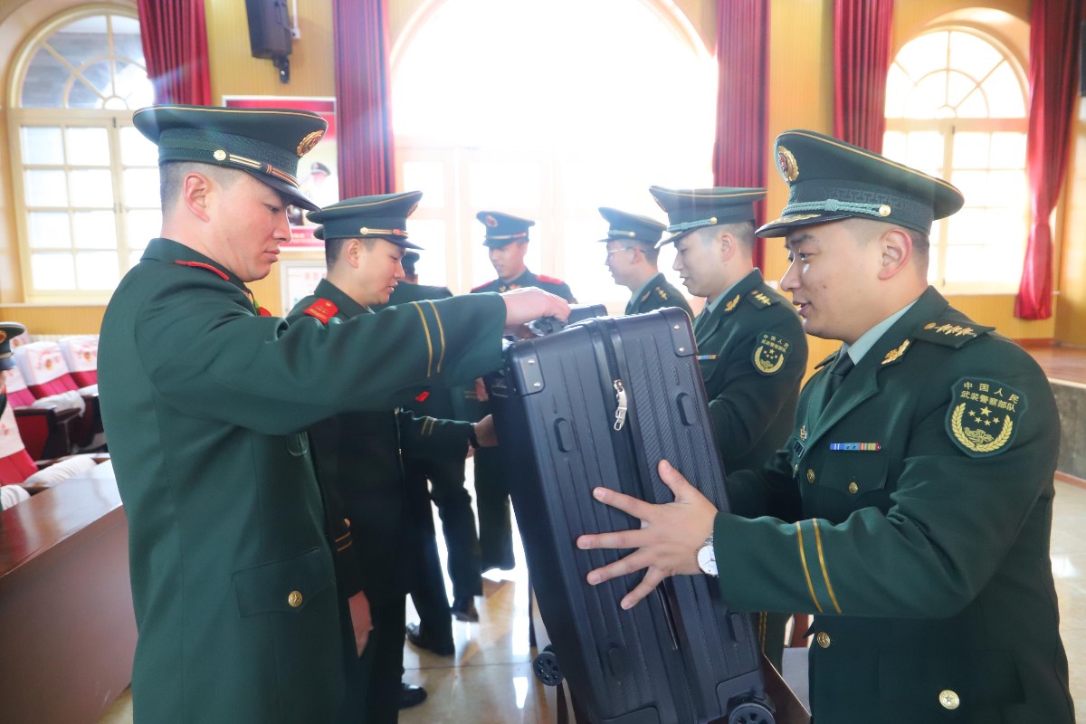 干部为退伍老兵颁发纪念品和卸衔、帽徽、胸标等