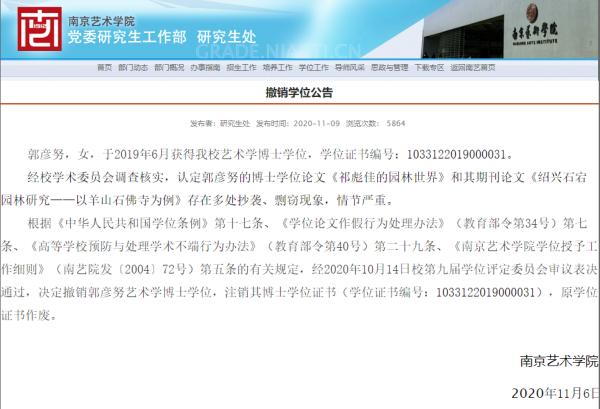 11月,郭彦努的毕业院校南京艺术学院亦因其论文存在抄袭、剽窃决定撤销她的博士学位。