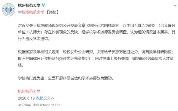 8月19日,杭州师范大学官方微博发布通报称,对近期关于学校教师郭彦努公开发表文章《绍兴石宕园林研究—以羊山石佛寺为例》(论文署名单位非杭师大)存在抄袭现象的反映,经学校学术道德委员会调查,认为相关情况基本属实,其行为违反学术道德。