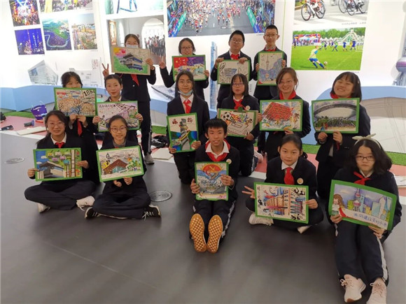 第三版块展示主题是“小手画未来”,来自初二年级的同学在王宗良老师带领下,在展览馆内进行实地创意写生:以展区内展现的标志性建筑为模本,加以自我的想象,进行再创作,用艺术的笔触感知30年来浦东的变化。