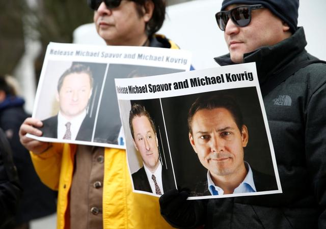 (图说:2019年3月在温哥华,民众在孟晚舟引渡听证会后举着标语,呼吁中国释放"两个迈克尔"。图/Reuters)