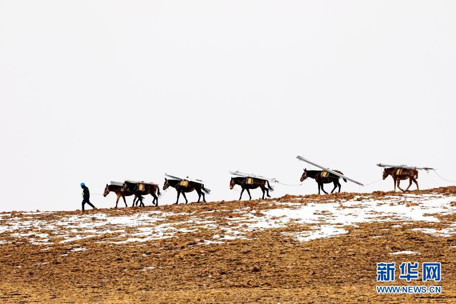 在西藏日喀则市拉孜县与定日县交界处的嘉措拉山上,施工人员用骡子向施工点运送材料(4月25日摄)。新华社发