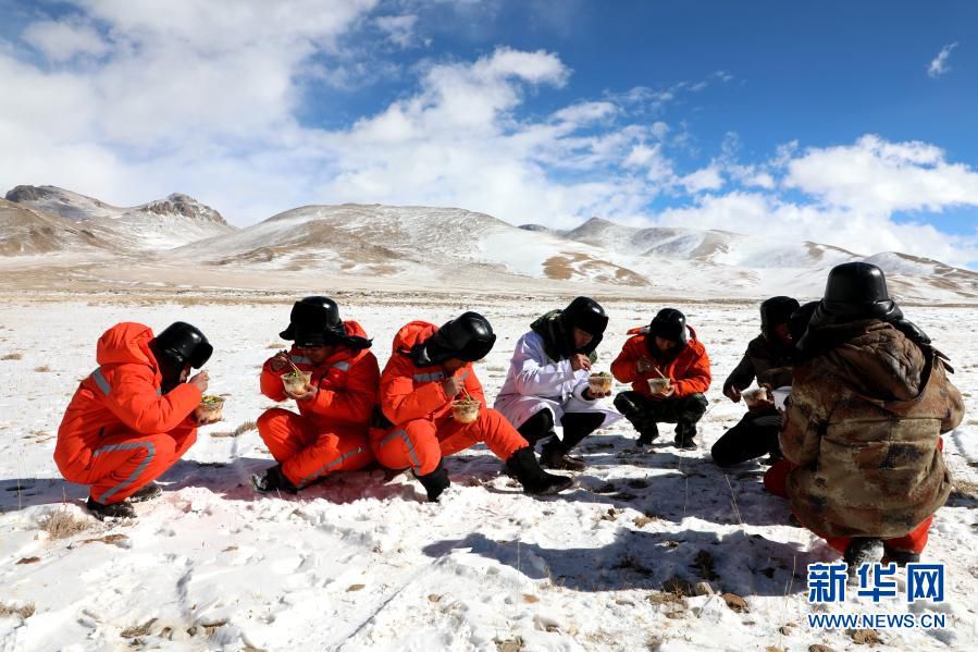 在西藏阿里地区噶尔县,施工人员在西藏阿里与藏中电网联网工程线路13标段吃午饭(2019年12月21日摄)。新华社发