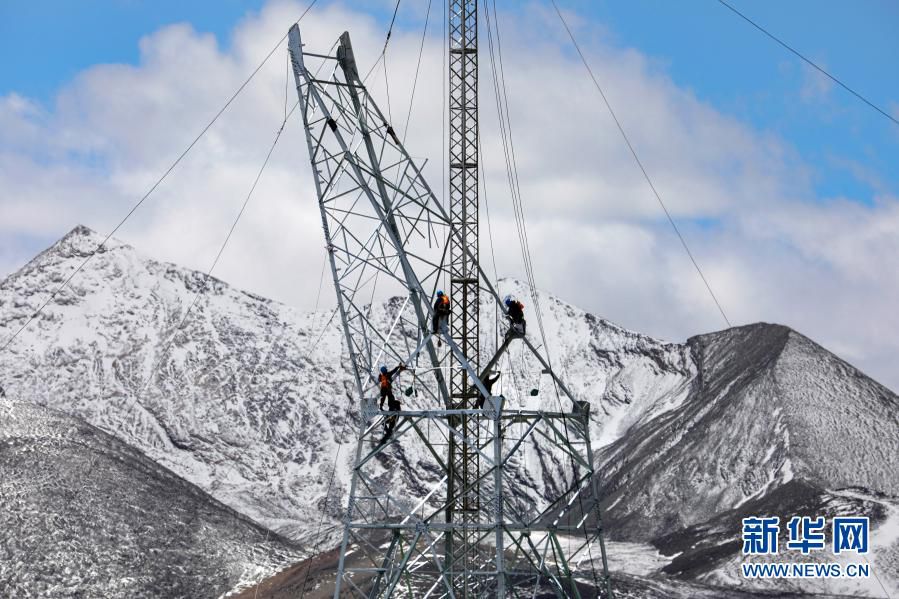 在西藏日喀则市定日县,施工人员在西藏阿里与藏中电网联网工程线路4标段作业(4月28日摄)。新华社发