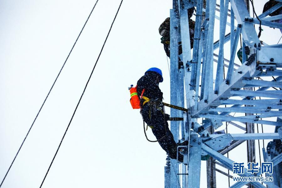 在西藏日喀则市定日县,西藏阿里与藏中电网联网工程线路4标段施工人员在风雪中作业(5月2日摄)。新华社发
