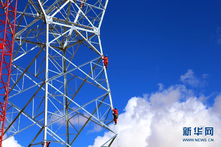 在西藏日喀则市聂拉木县,施工人员在西藏阿里与藏中电网联网工程线路7标段进行塔上作业(4月16日摄)。新华社发