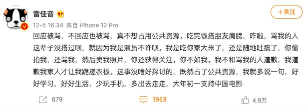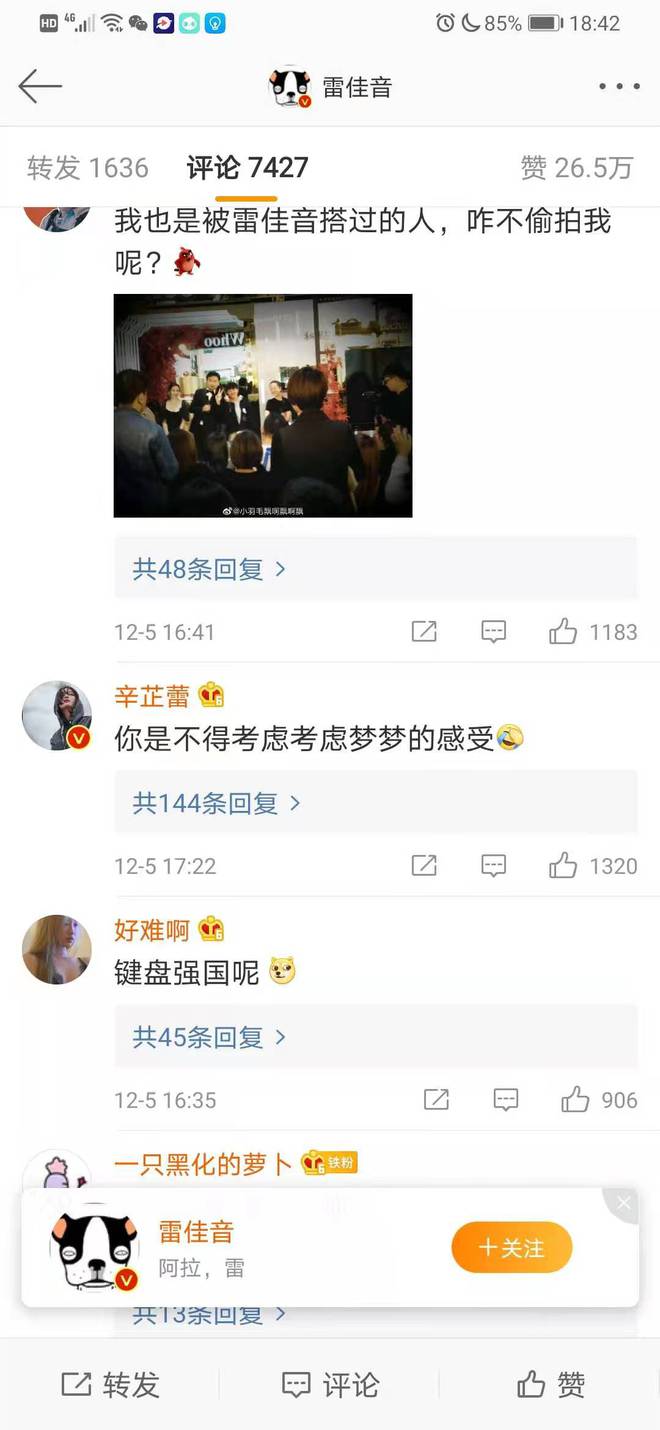 网易娱乐12月5日报道    12月5日,网曝雷佳音当街搂肩美女的视频引发热议,雷佳音发微博回应,称就是吃完饭搭朋友肩膀,回应被骂,不会回应也被骂。雷佳音写道:“骂我的人这辈子没搭过呗,就因为我是演员不许呗。我是吃你家大米了,还是随地吐痰了,你偷拍我,还骂我,然后卖我照片,你还获得关注。你不如我。我不和骂我的人道歉,我道歉我家人才让我跪搓衣板。” 辛芷蕾在其微博评论称:“你是不得考虑考虑梦梦的感受。”疑似帮好友雷佳音澄清,有网友表示梦梦就是雷佳音的助理。