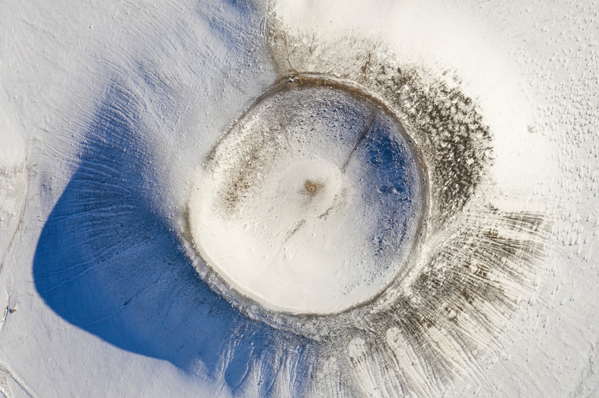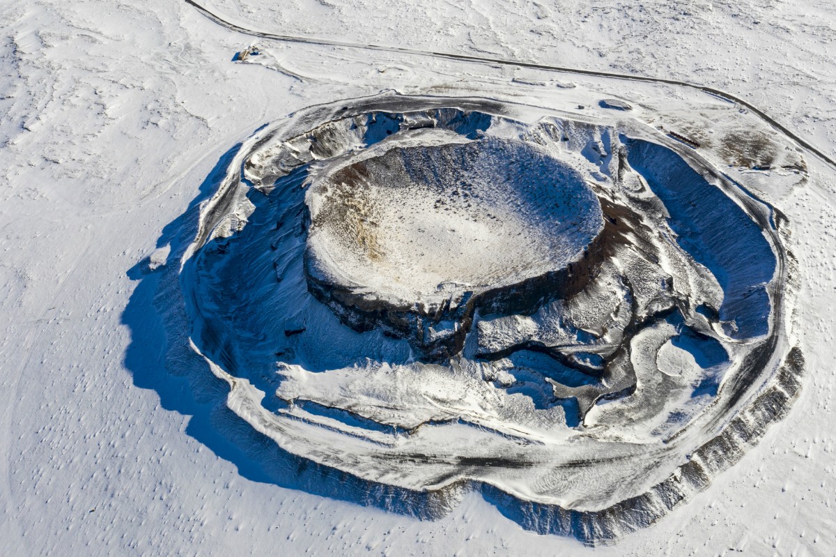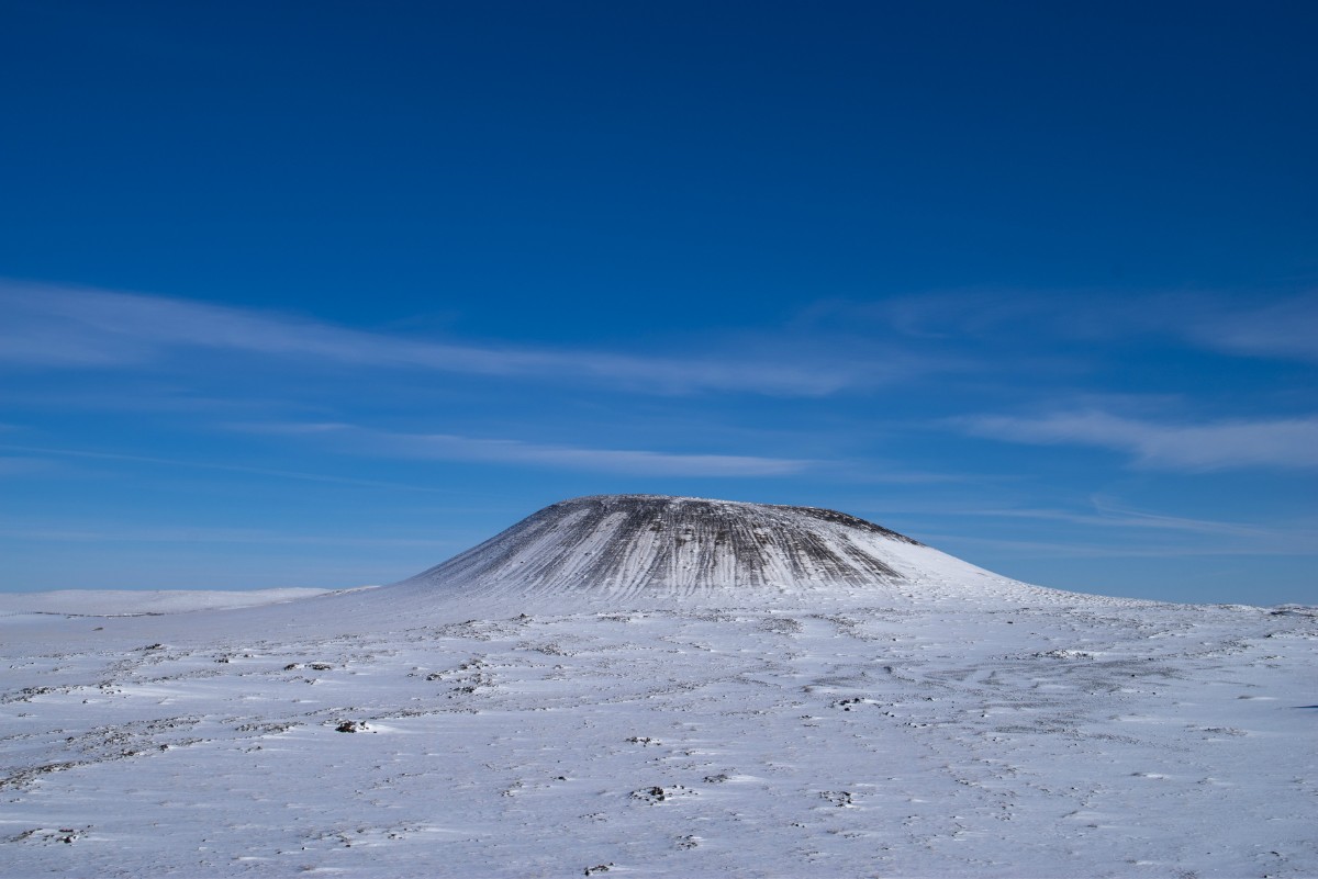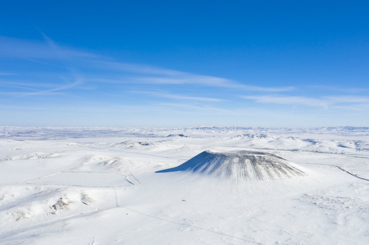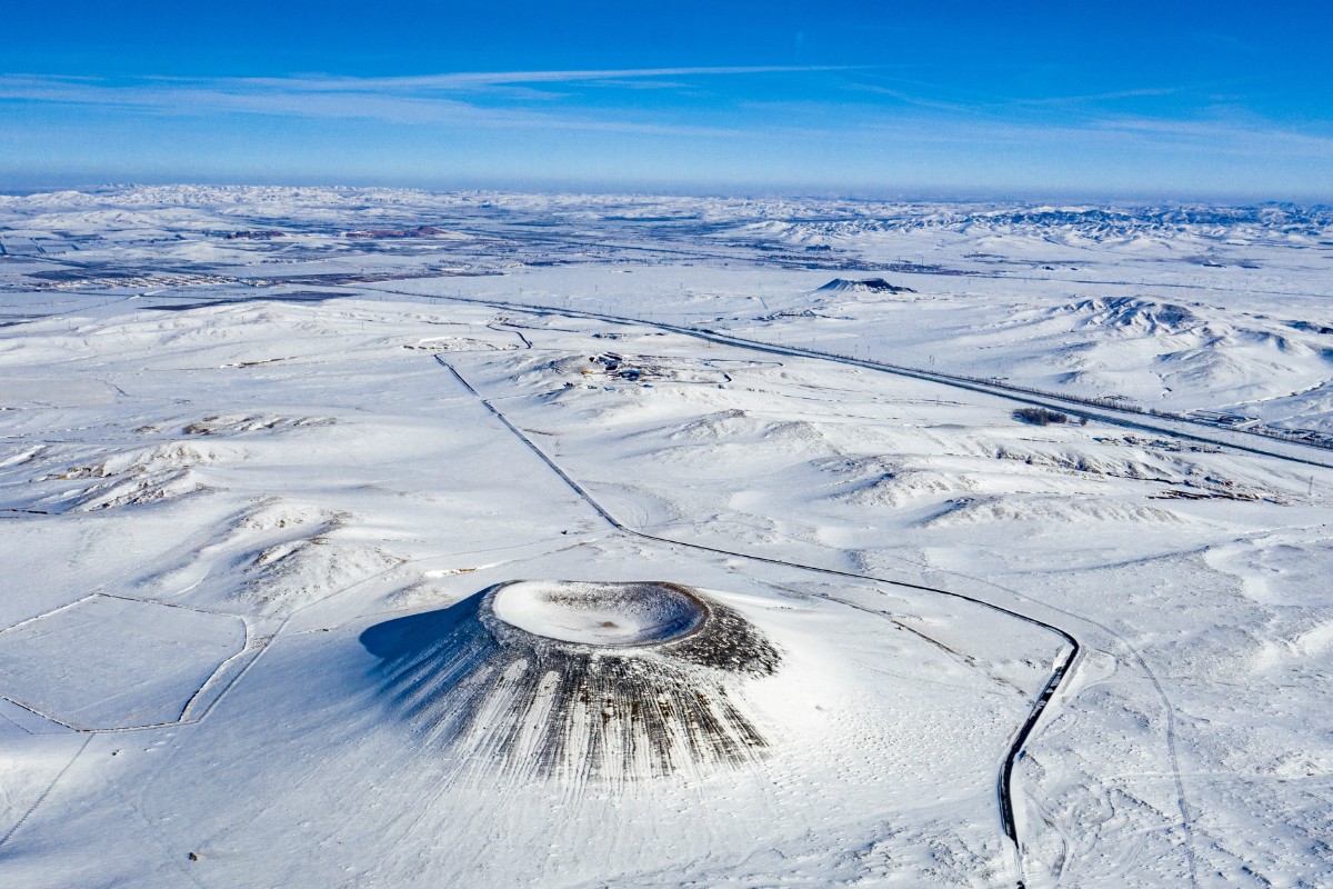 乌兰哈达火山群位于乌兰察布市察哈尔右翼后旗和察哈尔右翼中旗相接的地带,30多座火山如串珠状分布在辽阔的草原上。冬日里,皑皑白雪覆盖草原,火山熔岩地貌与雪原交相辉映,冰雪火山的奇妙身姿展露无遗。