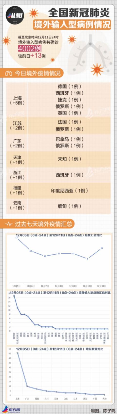 国内方面,据国家卫健委通报:12月11日,31个省区市和新疆生产建设兵团报告新增确诊病例13例,均为境外输入病例(上海5例,江苏2例,广东2例,天津1例,浙江1例,福建1例,云南1例);无新增死亡病例;无新增疑似病例;新增无症状感染者17例(境外输入15例)。