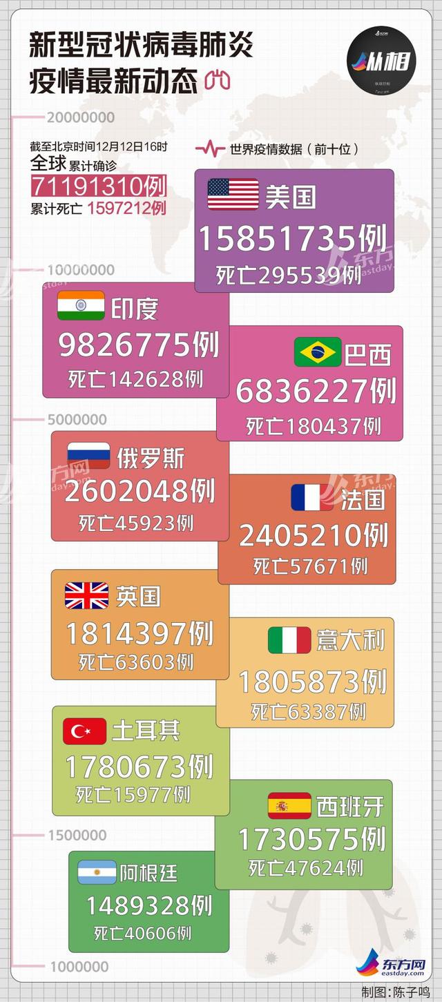 美国约翰斯·霍普金斯大学的疫情统计数据显示,截至北京时间12月12日21时,全球累计确诊新冠病例超7119万例,累计病亡近160万例。