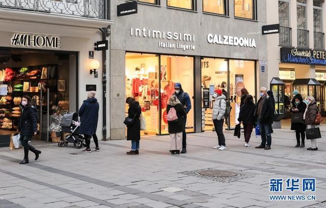 (图说:12月11日,在德国慕尼黑,戴口罩的人们排队等待进入一家商店。来源:新华社)