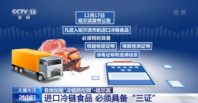 哈尔滨发布公告,凡进入哈尔滨市的进口冷链食品,必须同时具备检验检疫证明、核酸检测证明、消毒证明和追溯信息。对相关票据不全、来源不明、证物不符的进口冷链食品,一律禁止进入哈尔滨市。
