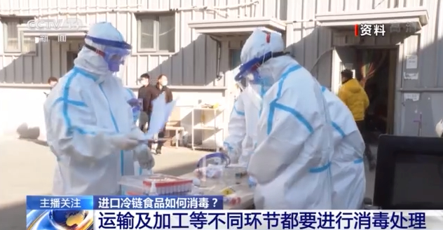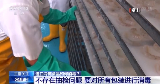 中国疾控中心消毒学首席专家 张流波: 国外进口的这些冷链食品,我们在做消毒的时候,一般要求在海关就开始进行消毒。因为食品包装它可能有集装箱、大包装、中包装、小包装。所以在运输的过程中,在加工生产的过程中,它就需要在不同环节进行消毒处理。