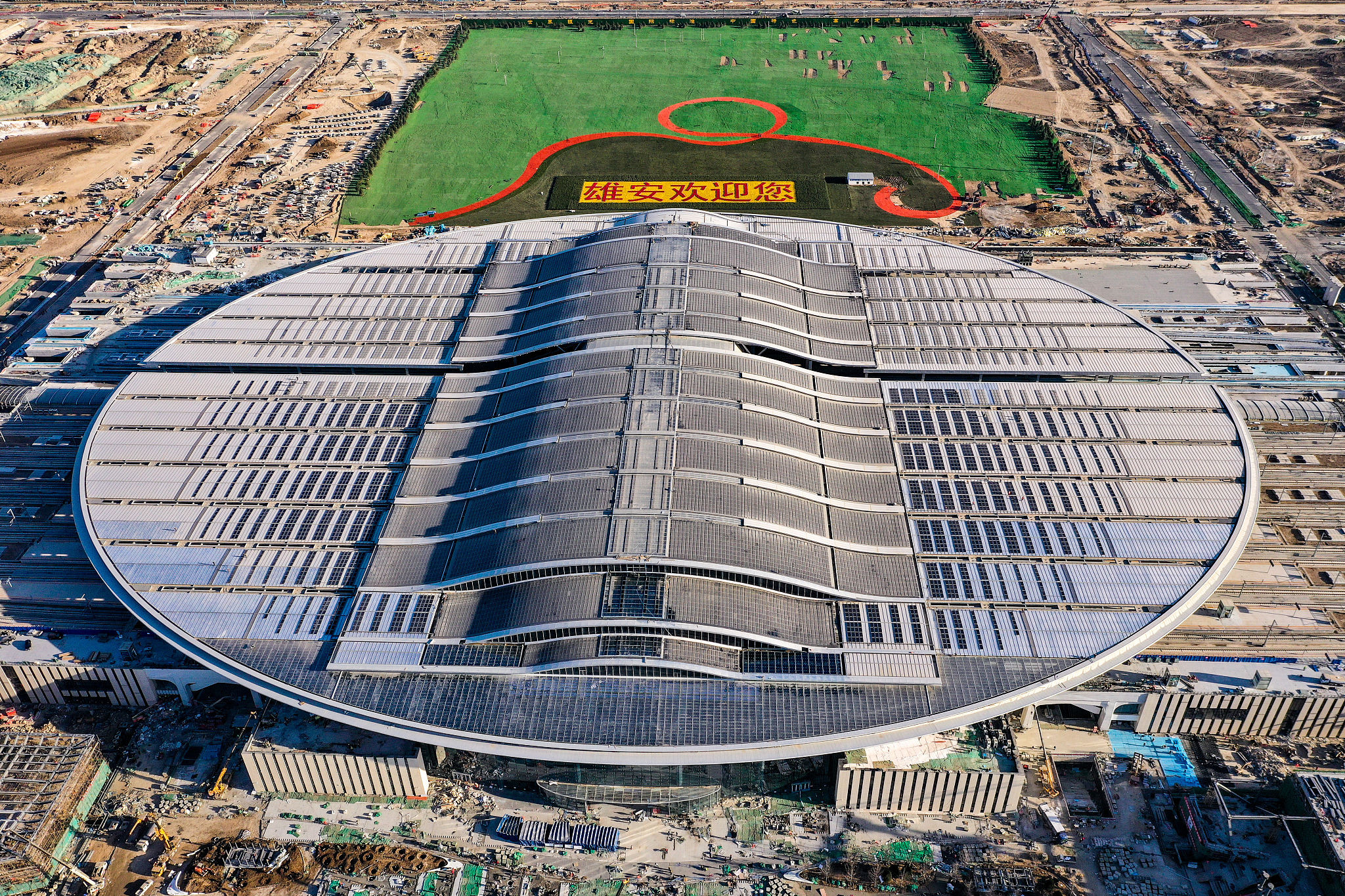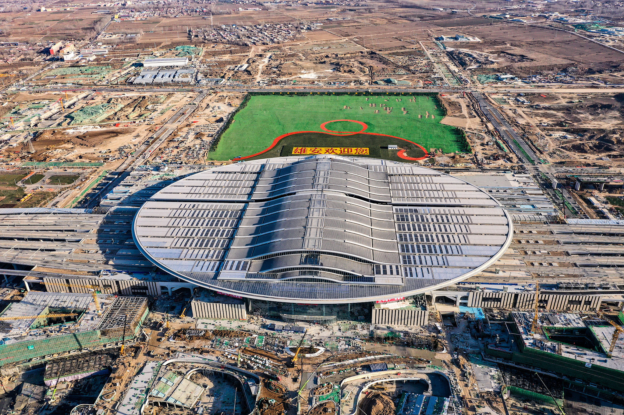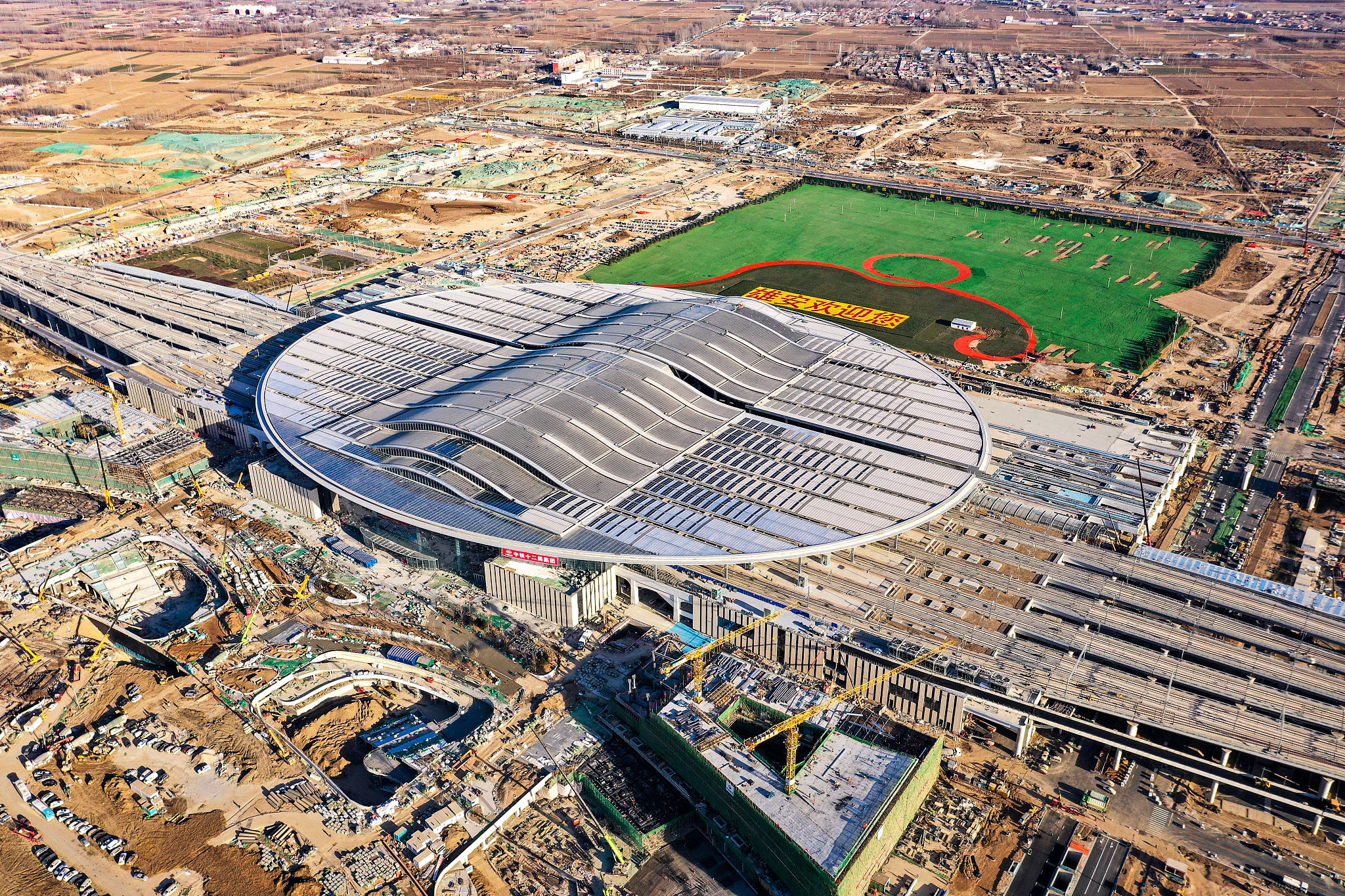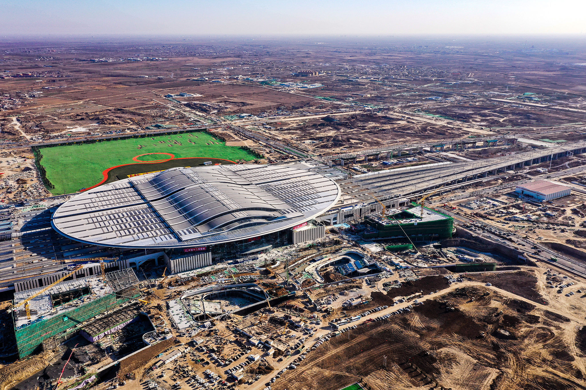 2020年12月18日,航拍雄安高铁站建设现场。作为雄安新区首个开工建设的大型基础设施工程,京雄城际铁路雄安站站房于12月10日通过初步验收,预计2020年年底投入使用。(来源:视觉中国)