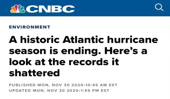 △美国消费者新闻与商业频道报道,2020年的飓风活动之频繁突破了历史纪录