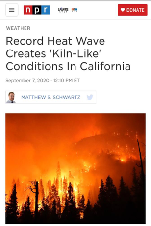 △美国国家公共广播公司(NPR)报道,加利福尼亚州高温天气导致大面积火灾