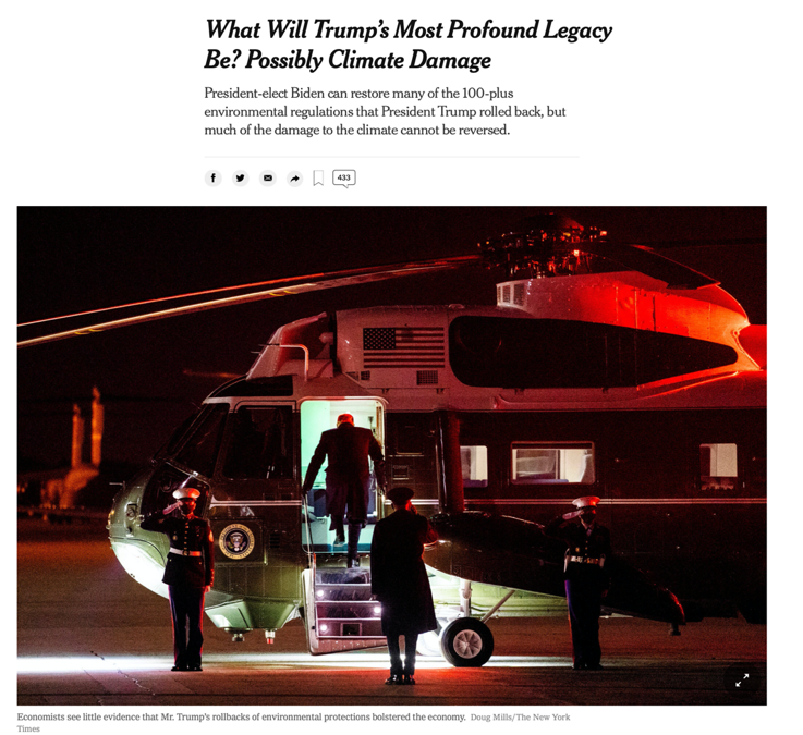 《纽约时报》认为,特朗普政府的环境政策已经给美国,甚至是全世界造成了永久性伤害。尽管当选总统拜登多次表示将坚定抗击气候变暖,然而即使他推翻前任政府的所有不利政策,也很难逆转环境恶化的趋势。因为温室气体排放,会进一步导致本来禁锢在冰层中的温室气体加速泄漏,而这一点是不会随政策变化而改变的。