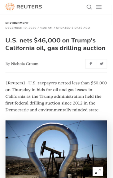 此外,随着大选形势逐渐清晰,特朗普似乎有意抓紧最后的时间在环境问题上大做文章。当地时间12月10日,特朗普政府宣布,将拍卖南加州和阿拉斯加州等地的石油开采权。特朗普政府曾在2018年首次宣布,将出售美国90%以上海域的石油开采权,但因遭到关键摇摆州佛罗里达州选民的反对而被迫搁置。没有了选举压力的特朗普终于得以重提此事,这更是为下任政府埋下了一颗“定时炸弹”。