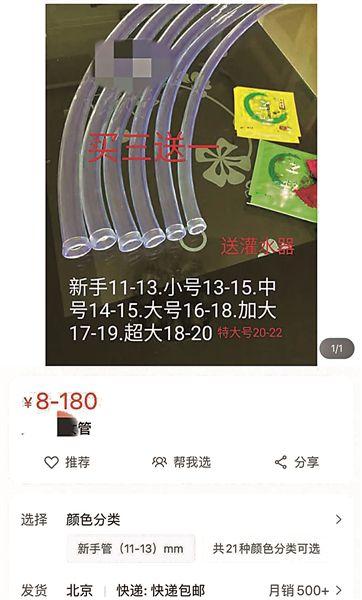 一家售卖催吐管的商家信息显示,该商品价格为8元至180元,管子直径为10-60mm不等,还分为不同的软硬度,据介绍,该催吐管“采用经过检验的合格塑胶制成”。商品页面显示,该催吐管月销量在500根以上。商家称,一根管可以用一周的时间,“因为有胃酸的腐蚀,就像牙刷一样需经常更换”。据其称,用了管子后,吃完饭两三分钟就可以吐干净,一个月甚至能瘦十几斤。