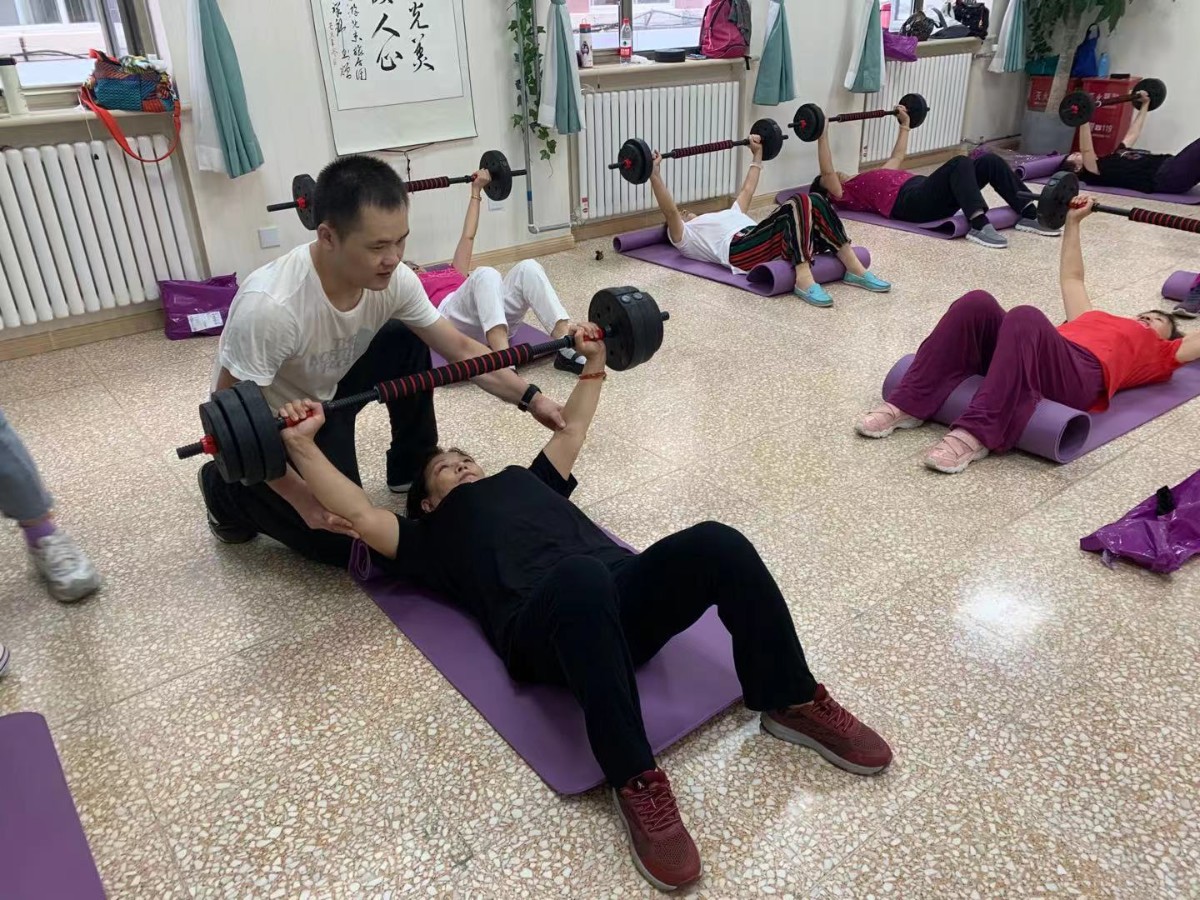 “单个中片、3磅的杠铃,拿给墙边第二排的阿姨,电视机旁的阿姨,两头各加一个小片……”张阿姨她们做完热身后,教练小李带着几个小姑娘组装杠铃,并且分发到位。站在后排的一个阿姨拿到器械后掂了掂,提出要求,“李老师,我觉得自己长劲了,能不能再给我加重点。”小李笑眯眯地婉言拒绝,“阿姨,这个重量是测算好的,您一定得听我的,咱们锻炼的时候可不是越重越好。”