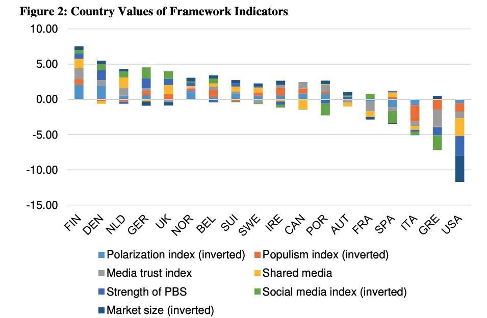 彭博社援引苏黎世大学研究者的评论称,美国人在所有标准的西方国家中,更倾向于相信“假新闻”,美国“具有轻易使得谣言与虚假信息快速传播的条件”。报告分析了导致谣言更容易传播的重要因素,一是极端对立的政治环境催生民众的撕裂;二是缺少监管的媒体环境。