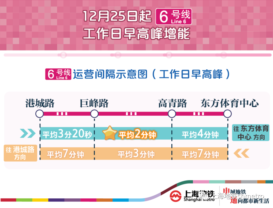 申通地铁集团说,6号线12月25日起将再次启用新列车运行图,早高峰时段将增投10列上线列车,晚高峰也将增投3列。届时,巨峰路站→高青路站区段早高峰时段运行间隔将仅为平均2分钟。详见下文↓