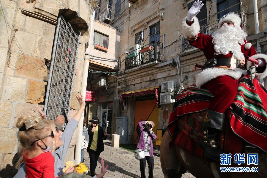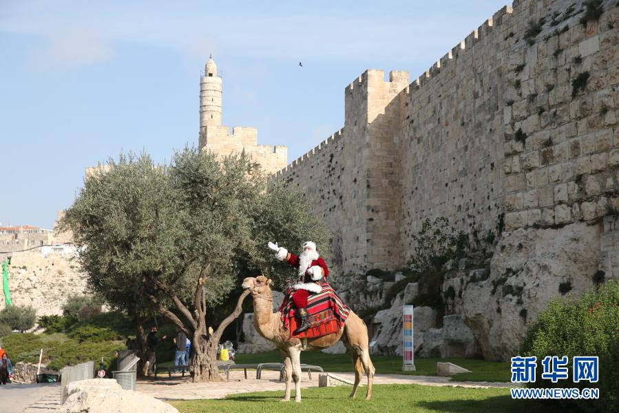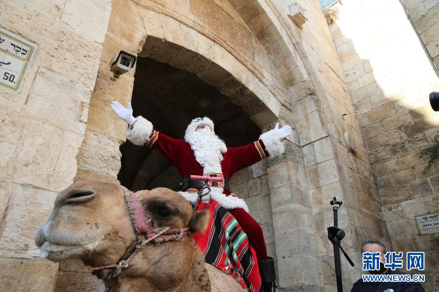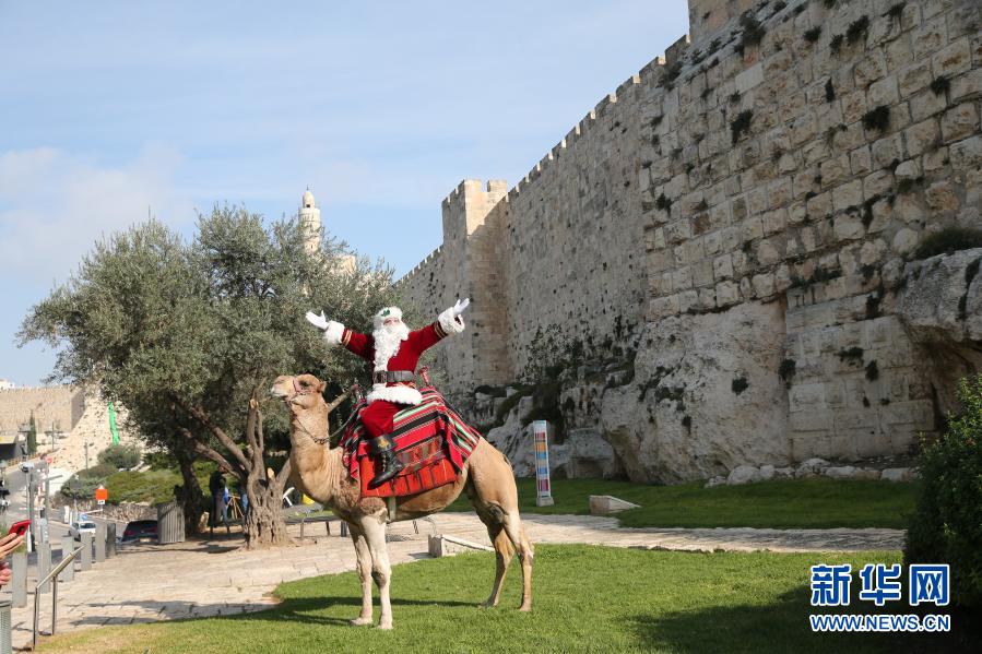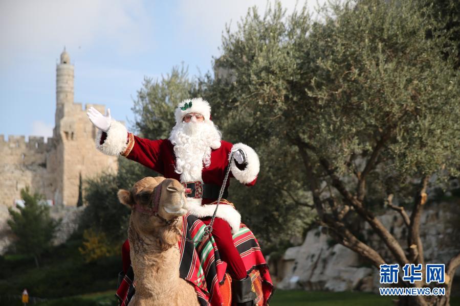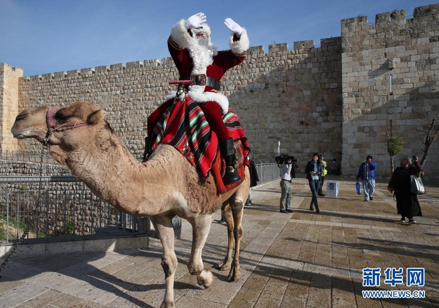 12月22日,卡西西耶装扮的“圣诞老人”骑着骆驼在耶路撒冷向人们挥手致意。圣诞节前夕,居住在东耶路撒冷的伊萨·卡西西耶装扮成“圣诞老人”,骑着骆驼向人们送去祝福。