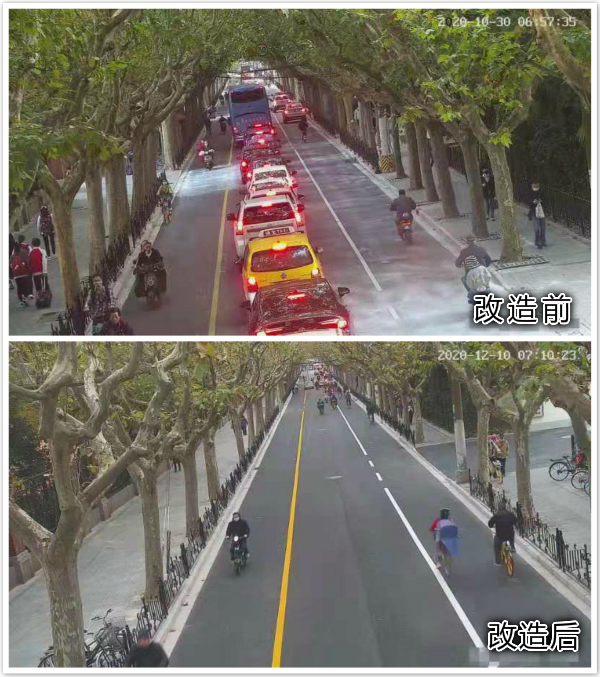 图说:零陵路道路改造前后的高峰路况对比。徐汇警方供图(下同)