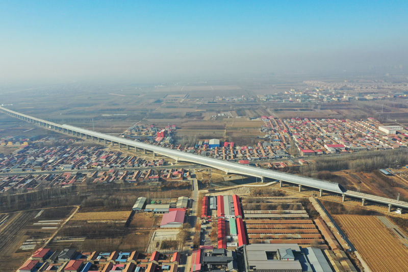 京雄城际铁路河北霸州段的全封闭声屏障(12月25日摄,无人机照片)。新华社记者 牟宇 摄