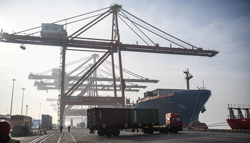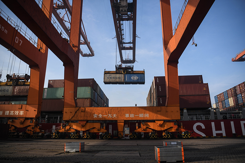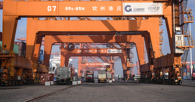 车辆在钦州港码头中转集装箱(12月28日摄)。新华社记者 张爱林 摄