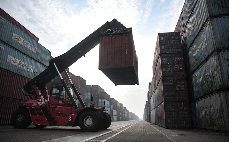 12月28日,一辆吊车在钦州港码头集装箱存放地吊运集装箱。新华社记者 张爱林 摄