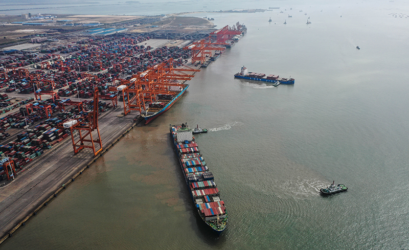 在钦州港码头,满载集装箱的海轮驶离泊位(11月19日摄,无人机照片)。新华社记者 张爱林 摄