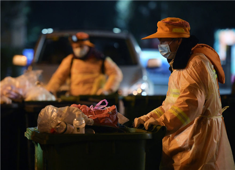 △2月1日,江岸环卫集团的工作人员仍在武汉街头清运社区生活垃圾。