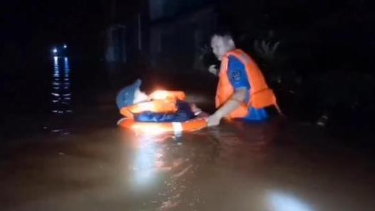 △8月17日,强降雨导致雅安青衣江水位暴涨,多地受灾。四川雅安公安连夜转移受灾群众。