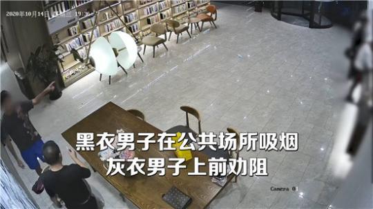 监控画面显示,李虎当时正在酒店大堂休息区看书。岳某在不远处点起一根烟,李虎先是向酒店前台服务员投诉,但服务员没有作为,此时少年来到岳某面前,指着墙上的禁烟标志劝阻。