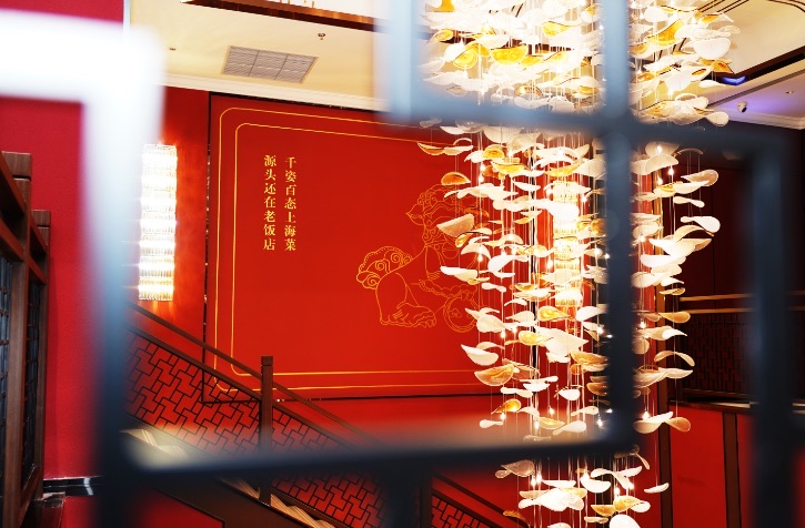 记者在现场看到,尽管是新店,但上海老饭店特有的历史文化感被设计师重新刻画。从进门开始,醒目的朱砂红和鎏金黄就裹挟着浓郁的国潮风扑面而来;地上,是富有上海滩复古时髦感的黑白格纹地砖;墙上,是精挑细选的上海老城厢旧照。