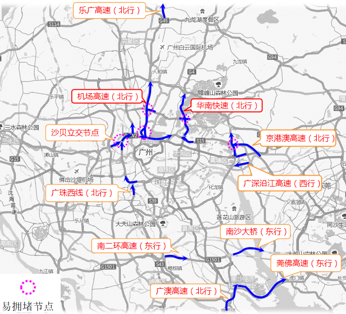预计出城高峰集中在节前12月31日17-21时、假期首日(1月1日)10-13时,假期最后一日(1月3日)17-20时将出现返程高峰。期间高速公路交通压力较大的路段主要分布在机场高速(三元里-蚌湖立交段)、华南快速路(春岗立交-石门堂隧道段)、乐广高速(花山互通立交-花山隧道段)、莞佛高速(坦尾立交-虎门大桥段)及北环高速(沙贝立交)等瓶颈路段,容易发生较长距离的行车缓慢。