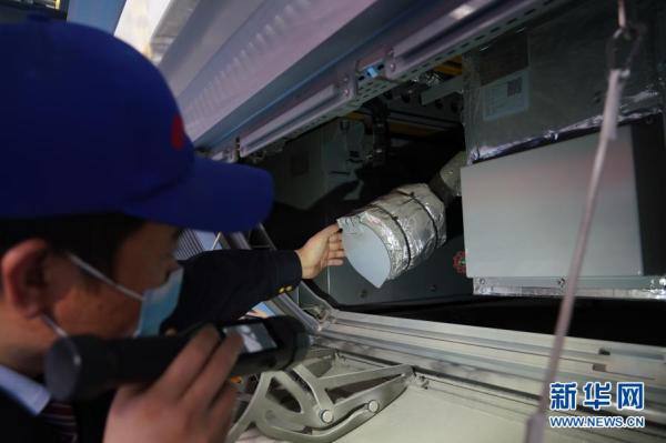 1月6日,中国铁路北京局集团有限公司北京动车段朝阳动车运用所的工作人员在检修新型高寒动车组水箱注水口,水管表面由防寒材料覆盖。新华社记者 陈钟昊 摄