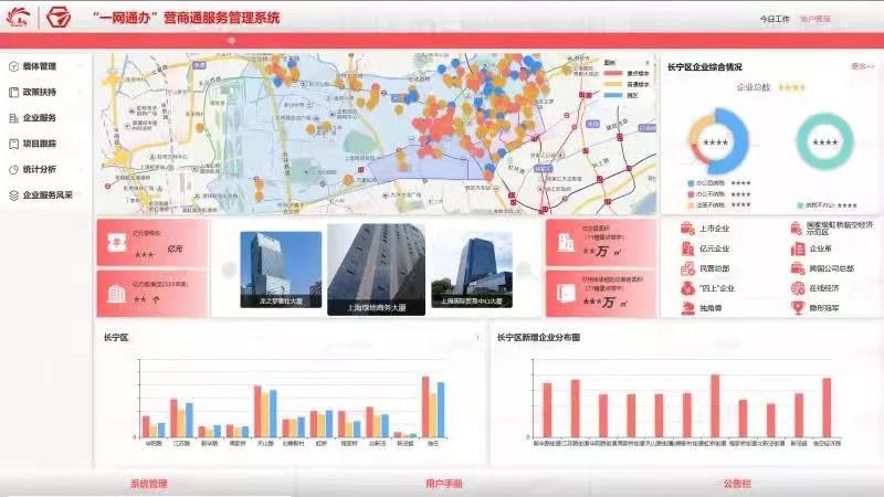 “营商通”三大功能· 服务匹配智能化通过长宁区大数据中心,与市法人库、市办件库对接,实现所有存量企业行业服务部门和属地服务街镇的双配齐;· 产业地图动态化运用三维动态技术,对全区300余处商办楼宇、产业园区进行分级分类展示,优化集聚,助力新一轮产业布局;· 政策语言市场化借助人工智能将政策语言转为机器算法,打造“政策计算器”,实现惠企政策一键计算、一屏展示。